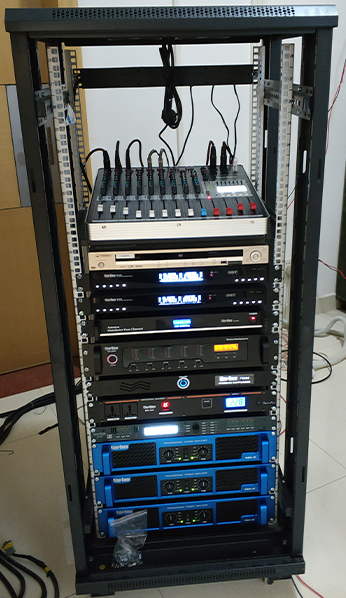 放大設備——指對經過調控設備混音輸出、信號處理后的信號進行后級功率放大設備,這里指專業功率放大器;重放設備——指將經過后級功率放大器放大的音頻信號進行電—聲轉換并釋放表現出來人耳可懂的聲頻信號的設備,這里指揚聲器;